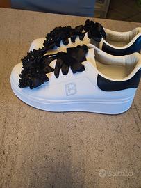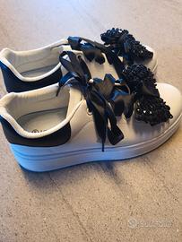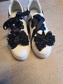 Scarpe bianche con fiocco nero ( rimovibile e applicabile) Laura biagiotti, nuove MAI usate. ottima comodità, veste morbido. vendo con scatola originale. numero 41