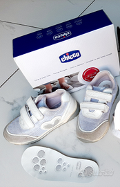 Scarpe usate pochissimo bianche con a lato un cuore argento con brillantini, chiusura a strappo. Soletta in pelle con sistema traspirante Chicco. Euro 19