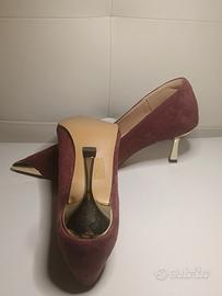 scarpe bordeaux con punta e tacco dorati, in tessuto effetto scamosciato mai utilizzate numero 41