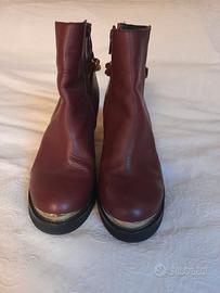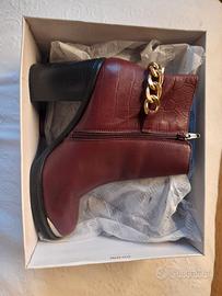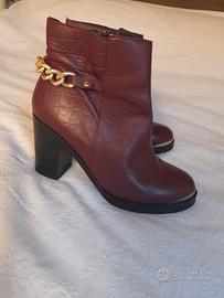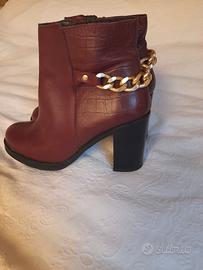 Eleganti stivaletti in ecopelle bordeaux, con tacco largo e comodo da circa 8-9 cm. Il design è impreziosito da una catena dorata decorativa sul retro e da una texture effetto coccodrillo su una parte della tomaia. Zip laterale per una calzata facile e veloce. Punta leggermente arrotondata con dettaglio metallico argentato.