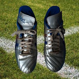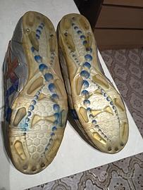 scarpe da calcio Asics n. 42, colore argento con dettagli blu e arancio,
