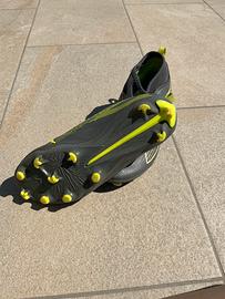 Vendo scarpe da calcio Puma Ultra per bambino, colorazione grigio antracite con dettagli giallo fluo. Il modello è quello "Laceless" (senza lacci), progettato per offrire una superficie di tiro pulita e una calzata a compressione tipo calzino che fascia perfettamente il piede.