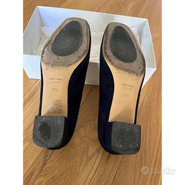 Scarpe decolleté in camoscio blu scuro, tacco cm 3, misura 37,5 italiana, con elegante catena dorata sulla parte anteriore, punta e tacco quadrati.