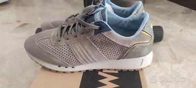 Vendo scarpe casual/sportive Wrangler(stagione primavera/estate), di colore grigio, tomaia in tessuto/scamosciato, fodera in tessuto, soletta in tessuto, plantare memory foam removibile, fondo in gomma, chiusura con lacci, acquistate lo scorso anno a fine stagione ma utilizzate solo un paio di volte quest'anno e non più indossate in quanto il numero calza piccolo per il mio piede, quindi sono in ottimo stato