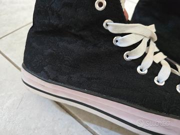 2 paia di scarpe stesso modello, uno di colore blu, con fantasia fiorita e lacci tipo raso di colore bianco e uno paio di colore nero con stessa fantasia fiorita e lacci normali bianchi.