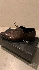 Vendo un paio di scarpe Cesare Paciotti stringate brogue, modello in pelle marrone con dettagli traforati e texture coccodrillo sulla punta e sul tallone, originali al 100%.
