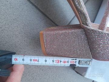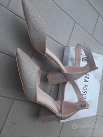 Scarpa a punta color Champagne in tessuto luccicante e cangiante, varia colore dal beige al rosso a seconda di come arriva la luce. Cinturino alla caviglia, pianta larga, nr 40, calza anche un nr. 41 se il piede è magro. Tacco largo alto 6 cm. Interno e suola di materiale sintetico. Mai indossate.