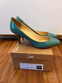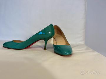 Décolleté Christian Louboutin, in vernice, color verde Tiffany. Misura 38. Altezza tacco 7 cm. Usate poco, ottimo stato.