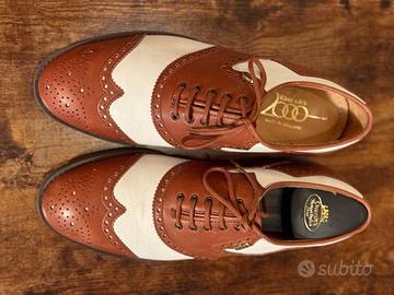 Si tratta di un modello raffinato e intramontabile, in pelle bicolore (marrone cuoio e bianco), con tipico disegno brogue che unisce tradizione artigianale e stile senza tempo.
