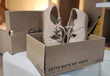 Eleganti scarpe Clarks in camoscio beige e dettagli rosa come in foto.
