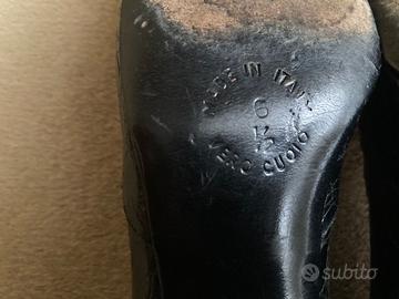 Raro ed elegante paio di scarpe in pregiato coccodrillo baby nero, realizzate da Valux, il maestro calzolaio delle eleganti donne milanesi del trentennio dopoguerra.