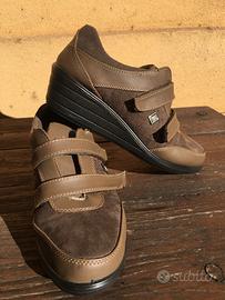 Comodissime, chiusura regolabile con velcro, tacco cm.4, pelle scamosciata marrone, suola antiscivolo, interno rivestito in tessuto, soletta interna in pelle, perfette, possibilità di prova.