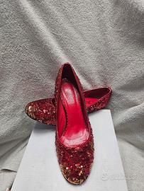 scarpe con tacco basso con pailettes rosse e oro