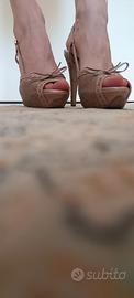 Scarpe con tacco alto color cipria, messe una sola volta, in vera pelle e fondo cuoio, con un piccolissimo difetto sulla parte interna del tacco della scarpa sinistra. Fatte a mano e comode nonostante il tacco alto.