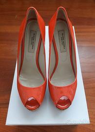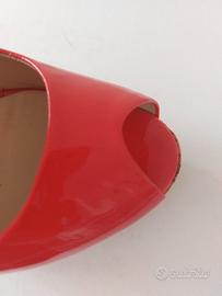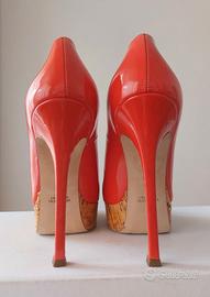 Decolletè spuntate Gianni Marra in pelle di vitello verniciata colore corallo. Altezza tacco 13 cm comprensivo di plateau esterno in sughero verniciato di 3,5 cm. Taglia 39. Manutenzione: spolverare con panno chiaro asciutto. Indossate due volte