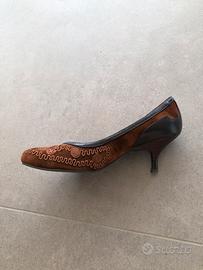 scarpe con tacco basso marroni con dettagli ricamati e rifiniture marroni lucide con fiocco, taglia 38, scarpe indossate pochissimo e tenute molto bene con nessun particolare segno di usura