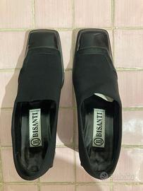 Scarpe a punta quadrata BISANTI colore NERO da donna, ideali per serate eleganti ma anche come alternativa per l'ufficio. La punta è quadrata e presenta un bellissimo dettaglio: è infatti composta da una parte in pelle lucida sull'estremità, e da una fascetta scamosciata.La tomaia è in tessuto, la suola in vero cuoio (certificato). Tacco quadrato; altezza del tacco 5 cm circa, numero 37. Presente la scatola originale.