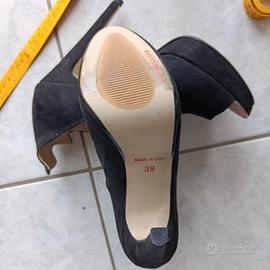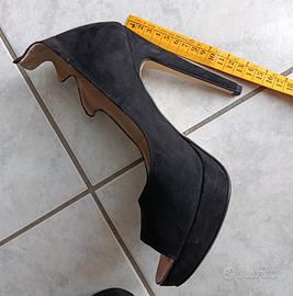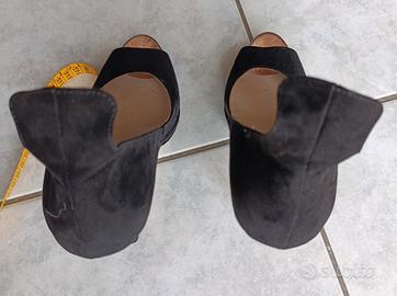 Scarpe décolleté nere con apertura anteriore,n. 39, tacco 14 cm con plateau, forma originale nella parte posteriore zona caviglia. Indossate una sola volta in perfette condizioni .
