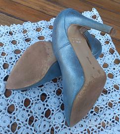 Décolleté celeste brillantinato, simil pelle, misura 41 (calzano strette), tacco 10 cm, tacchetti originali di ricambio - utilizzate una sola volta.