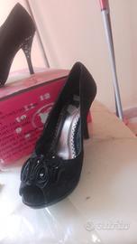 vendo scarpe nere usate un giorno solo di matrimonio... con tacco e roselline avanti, con fiori ai lati fatti di brillantini.... dentro si è tolto un mpo di colore perché avevo attaccato le solette di pezza con lo scotch per non fare scivolare il piede ma togliendo lo scotch si è tolto anche il colore....