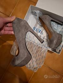 Vendo scarpe con tacco alto e plateau frontale marca Guess con confezione originale. Perfette condizioni, color grigio effetto scamosciato. Numero 38.