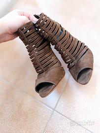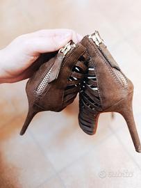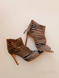 Vendo bellissimi sandali/tronchetti aperti con tacco a spillo firmati Zara Collection, taglia 37. Modello: Design a gabbia/intrecciato molto elegante e sensuale. Materiale: Finitura in morbido camoscio (suede) Dettagli: Chiusura rapida tramite zip posteriore sul tallone. Condizioni: Come nuove! Indossate pochissimo, senza difetti evidenti (vedi foto della suola e dei tacchi). Perfette per cerimonie, serate eleganti o per dare un tocco chic a un look casual con i jeans.