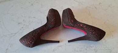 bellissime decolleté con zeppa 2 cm e tacco 12 cm. marroni scamosciate con inserti in raso bordeaux e brillantini. Molto eleganti ma con un bel paio di jeans anche sbarazzine. usate 1 sola volta perché porto il 37 ed invece ho acquistato il 36 perché pensavo calzassero meglio invece mi fanno male. morale taglia 36 . praticamente nuovissime senza alcun difetto. le avrò indossate 3 ore... possibile consegna di persona previo appuntamento . pagate 180 euro. non potendole utilizzare svendo. prezzo leggermente trattabile: accetto offerte congrue.