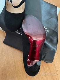 Scarpe nere scamosciate con cinturino decorativo e tacco alto.