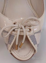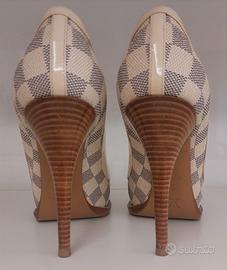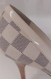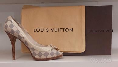 Decolletée spuntate Louis Vuitton in tela canvas Damier Azur a scacchi bianchi e azzurri. Dettagli in pelle di vitello verniciata bianca a bordatura, tacco in legno lucido, fiocchetto frontale in pelle di vitello bianca alle cui estremità chiudono barrette metalliche dorate con micro signature LV impresse. Impunture bianche visibili ad esaltarne l'artigianalità. Altezza tacco 11,5 cm comprensivo di plateau interno alla pianta del piede di 2,5 cm. Taglia 39 1/2. Dotate di box, e dust bag in tessuto da usare per riporle quando non si usano o in viaggio. Indossate una volta poiché di taglia troppo grande. Si allegano, inoltre, foto di box, custodie e dettagli che ne certificano l’autenticità compreso il codice identificativo interno (MA1110). Non si dispone di ricevuta in quanto andata smarrita (l’articolo è vintage originale). Disponibile ad inviare ulteriori foto nella chat di "Subito".