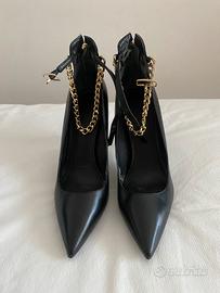 Scarpe con tacco décolleté Guess, colore nero in vera pelle, numero 37, scatola originale. Dotate di cinturino in pelle e catena colore oro rimovibile.