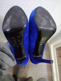In ottime condizioni, in ecopelle bluelettrico, punta aperta, plateau, misura 39, ancora nella scatola originale, marca primadonna