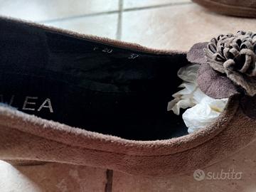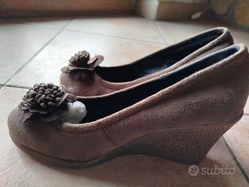 Scarpe con zeppa marroni Azalea,in camoscio sintetico,fiore davanti rimovibile,indossate 1 volta, come nuove. Tacco cm 8.