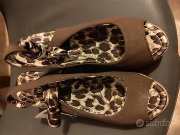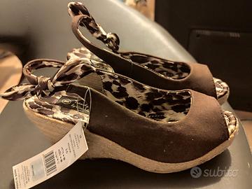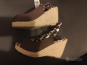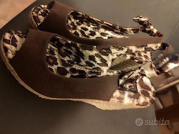 Vendo scarpe nuove mai usate. Colore marrone con pianta e fiocco leopardati e con zeppa in corda. Numero 36.