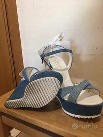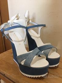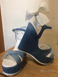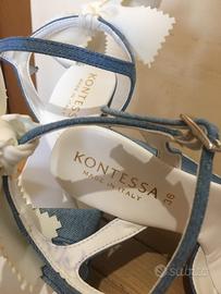 Sandali da donna con zeppa marca Kontessa made in Italy numero 36 tessuto jeans. Usate solamente una volta per una cerimonia, poi non più rimesse e conservate in ottimo stato nella scatola originale. Zeppa alta 12 cm, plateau anteriore alto 3 cm, tallone scoperto e allacciatura alla caviglia con cinturino regolabile. Fiocco posteriore rimovibile.