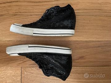 Converse All star con zeppa interna, rivestite di paillettes nere.
