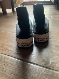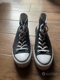 Sneakers Converse nere alte, originali, in ottime condizioni generali (piccolo difetto: un piccolo forellino laterale alla tela della scarpa destra) modello con gomma rialzata, n.39