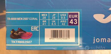 Scarpe da corsa cross Joma TKTR6S2707 color corallo con piastra in carbonio taglia 43. Le scarpe sono nuove mai messe con cartellino e scatola oringinali. Sul sito della joma sono messe in vendita a 179.9 euro e navigando in rete il minimo a cui si trovano è 115 euro, le vendo perché ho ricevuto un doppio regalo.