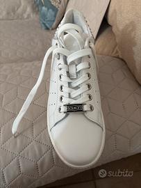Le scarpe sono state indossate una sola volta per un'occasione brevissima e sono praticamente pari al nuovo: il bianco è ancora brillantissimo, la suola è integra e non presentano alcun segno di usura, come puoi vedere chiaramente dalle foto. Il dettaglio della targhetta metallica logata sui lacci aggiunge quel tocco rock-chic tipico del brand che le rende adatte a qualsiasi outfit, dai jeans ai vestiti estivi.