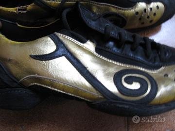 Vendesi scarpe da ballo numero 42 ANTARES modello Musical usate con un po' di colore oro su una scarpa andato via, la scarpa si presente integra con nessuna rottura sia esterna che interna fatta in vera pelle (nappa) e non made in Cina come lo Block....regalo borsa porta scarpe.
