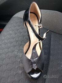 scarpa da ballo nuove n 38 usata una volta elegante lucida ..tacco 7.5 comoda ..nere lucide con striscia centrale argento ...