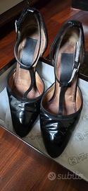 Modello elegante e raffinato, realizzato in pelle nera lucida con inserti in camoscio nero e suola in bufalo scamosciata, ideale per parquet o pista da ballo.