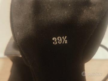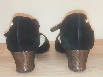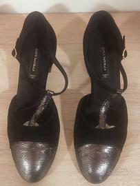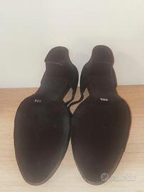 Scarpe da ballo artigianali da donna in pelle scamosciata nera. Taglia 39,5. Tacco altezza 5 cm. Suola in pelle di bufalo. Usate 2 volte, vendo pulite e igienizzate causa taglia sbagliata. Complete di scatola originale e sacca porta scarpe