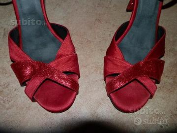 VENDO SCARPE DA BALLO, TG. 39, USATE. RASO ROSSO CON INSERTI E TACCO IN GLITTER ROSSO. TACCO 10.