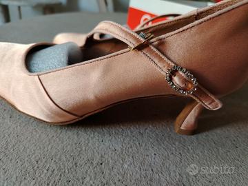 Scarpe da ballo " Quick and Slow" nuove, per danze standard/liscio/sala , in raso color cipria, tacco cm. 6, cinturino trasversale con chiusura a gancio, facile e veloce, misura n. 40.