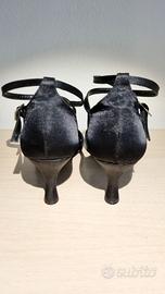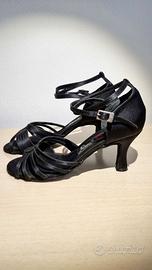 Scarpe da ballo modello sandali (per salsa, bachata…), taglia 39 con tacco 7 cm. Cinturino regolabile, fibbia metallica con logo, soletta e suola in pelle, dotate di scatola originale e piccola spazzola con denti metallici per grattare la suola. In buone condizioni con normali segni di usura sulla suola e nel cinturino interno. “Reina” è una marca spagnola specializzata in scarpe da ballo artigianali.