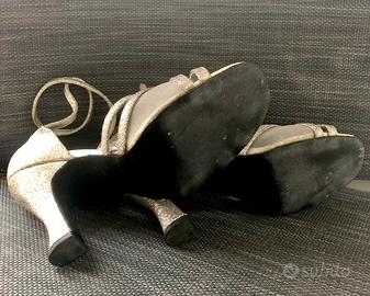 Vendo a 40 euro (+ event.spese di spedizione) scarpe da ballo ANNIEL, suola in buffalino,N 38, tacco 9cm. Calza piuttosto stretto, per piedi magri. Ho fatto mettere dal calzolaio un piccolo cuscinetto interno sul tallone perche mi dava fastidio il tallone chiuso, è rimovibile. Indossate poche volte, il tacco é troppo alto per me. Possibilità di prova/consegna a mano nelle vicinanze di Treviso - Vicenza.