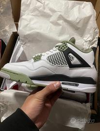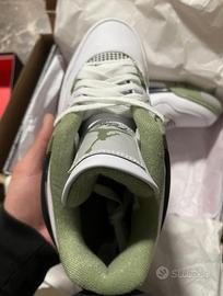 Le Jordan Air Jordan 4 "Oil Green" Sage Sea Salt sono scarpe da basket retrò mid-top da uomo e da donna. Presentano una tomaia bianca con dettagli verdi e neri. La silhouette classica e il logo Jumpman le rendono una scarpa elegante e versatile.