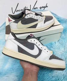 Travis Scott x Jordan Air Jordan 1 in pelle scamosciata a doppio strato, una scarpa da basket bassa retrò alla moda per uomo e donna. Disponibile in bianco e marrone, con un tema moka invertito e un gancio bianco e marrone invertito, la collaborazione mette in risalto l'esclusivo tallone, con il logo ghost face e le ali su entrambi i lati. È elegante e unica, davvero sbalorditiva.