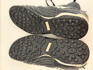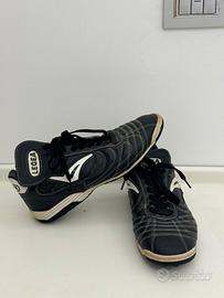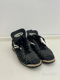 Classiche scarpe da calcetto LEGEA in pelle sintetica nera con cuciture bianche a contrasto e suola in gomma con tacchetti piccoli. Modello storico, comodo e resistente, perfetto per chi ama lo stile old school.