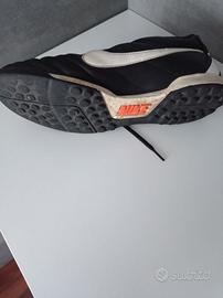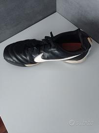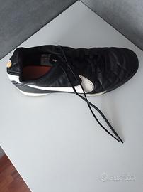 Scarpe da calcetto Nike nere con logo bianco, modello stile calcio indoor, numero 45. Usate ma in buone condizioni (come da foto), comode e ancora perfettamente utilizzabili. Colore: nero/bianco Materiale: simil pelle Chiusura con lacci Ideali per sport leggero o uso quotidiano